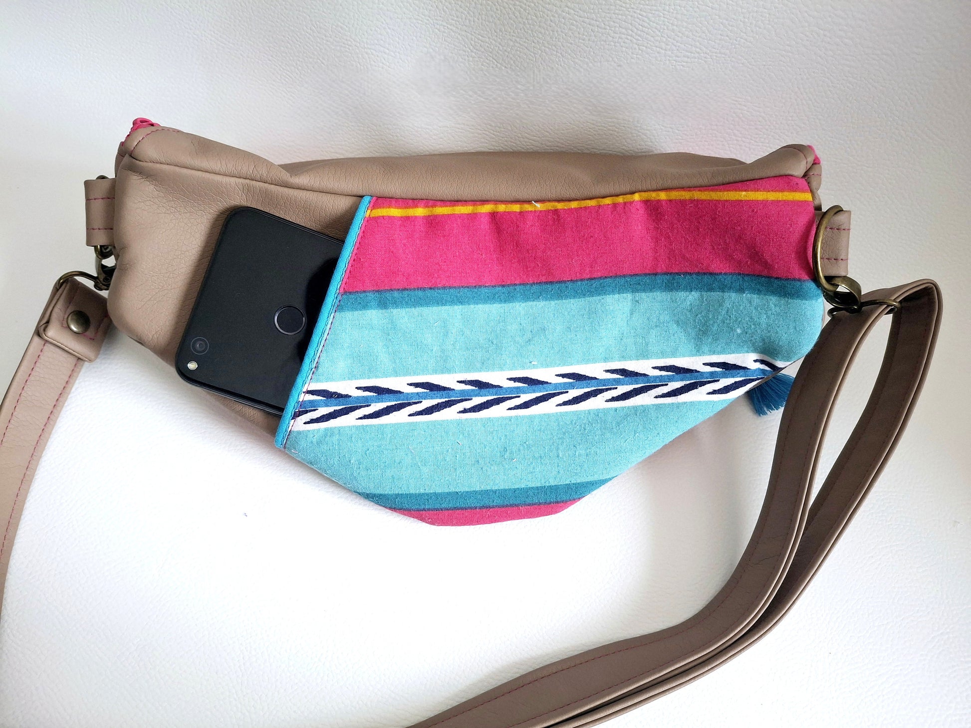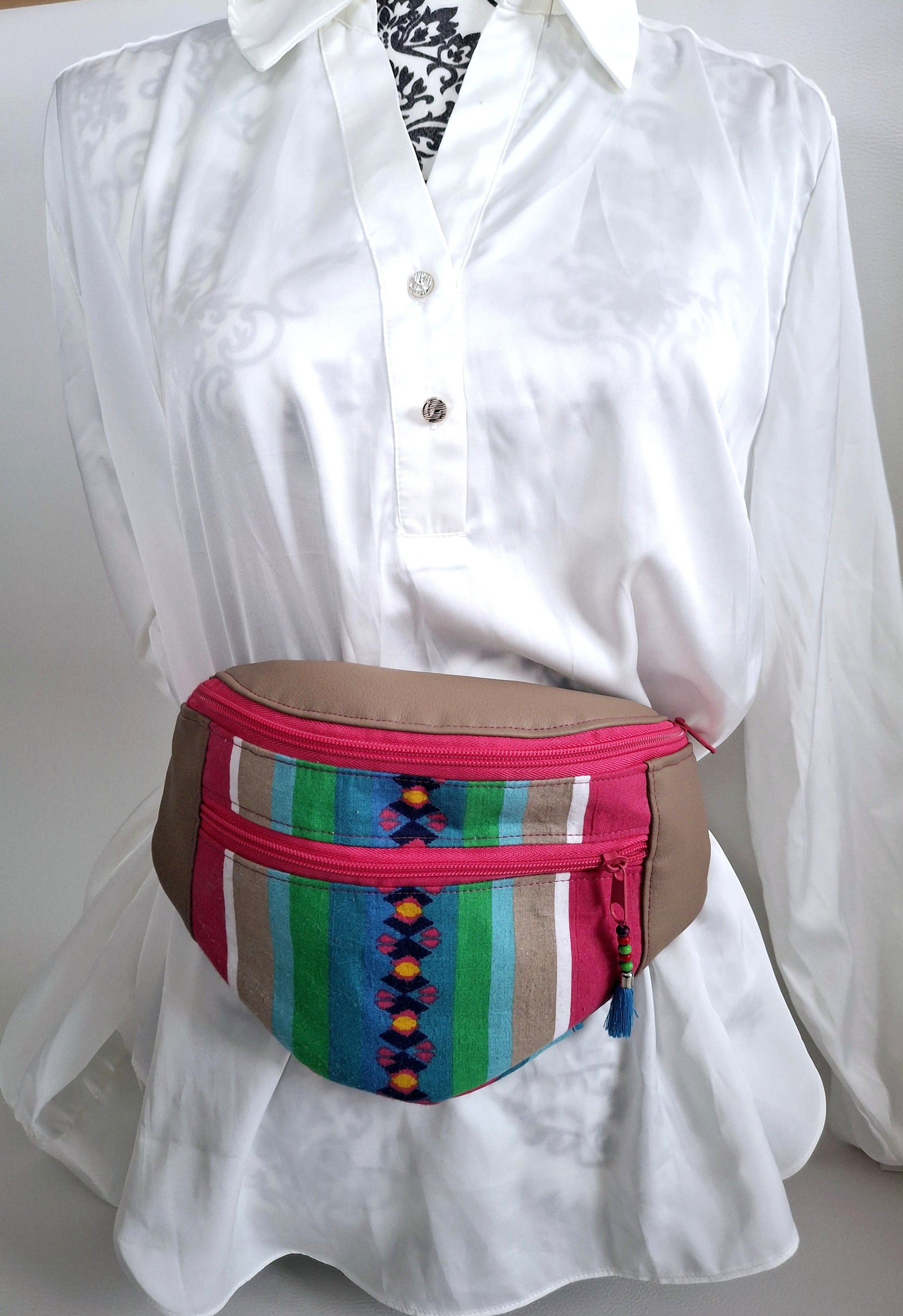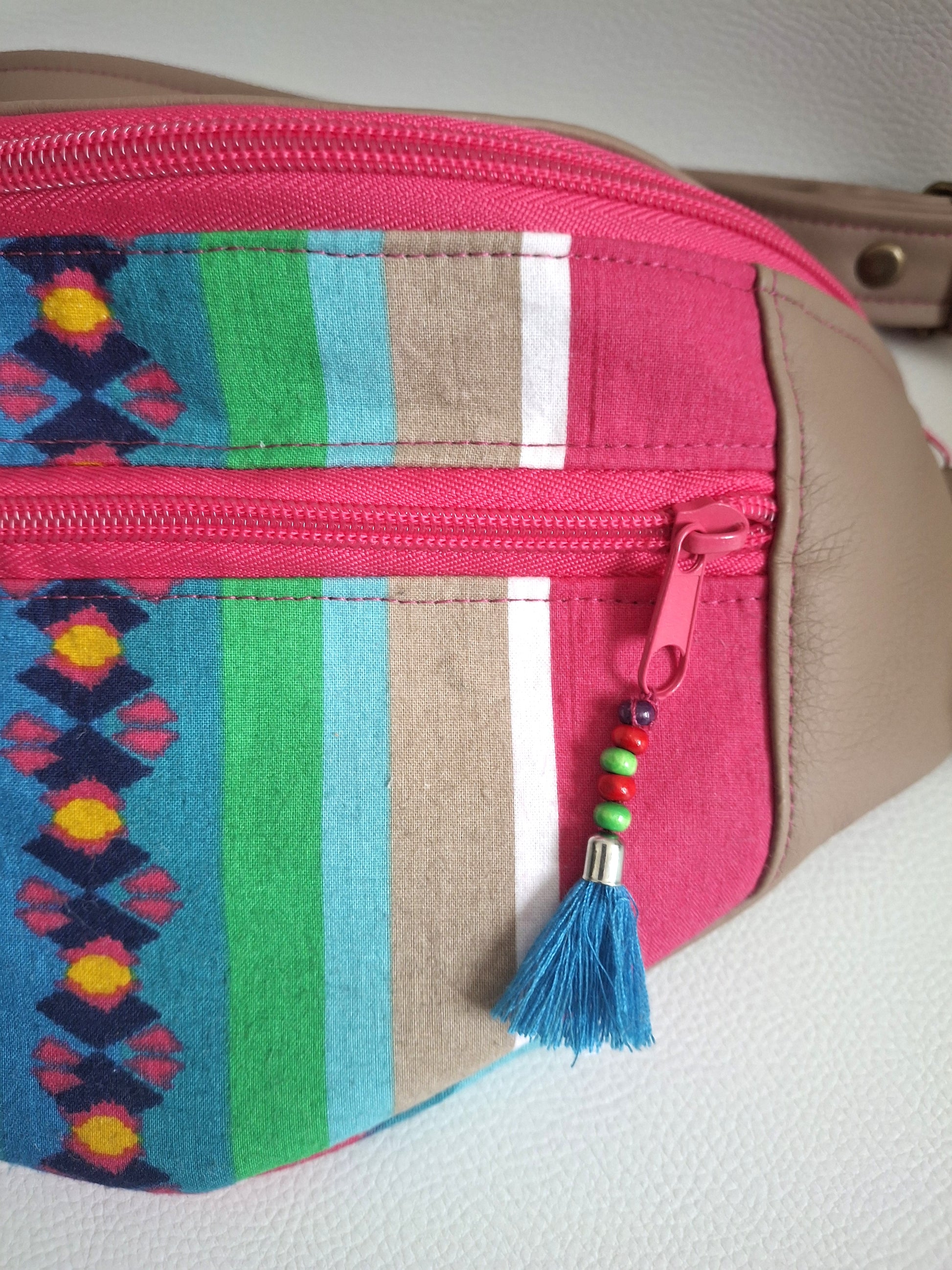 Le Sac Banane Lova, fabriqué en simili et tissu upcyclé aux couleurs vives, apporte une touche de fraîcheur à votre look. Il dispose d'une poche arrière discrète pour accéder facilement à votre téléphone, ainsi que d'une petite poche zippée à l'avant. La poche principale, également zippée, est divisée en deux par une poche plaquée aimantée et comprend un mousqueton, pour une organisation simple et efficace au quotidien.