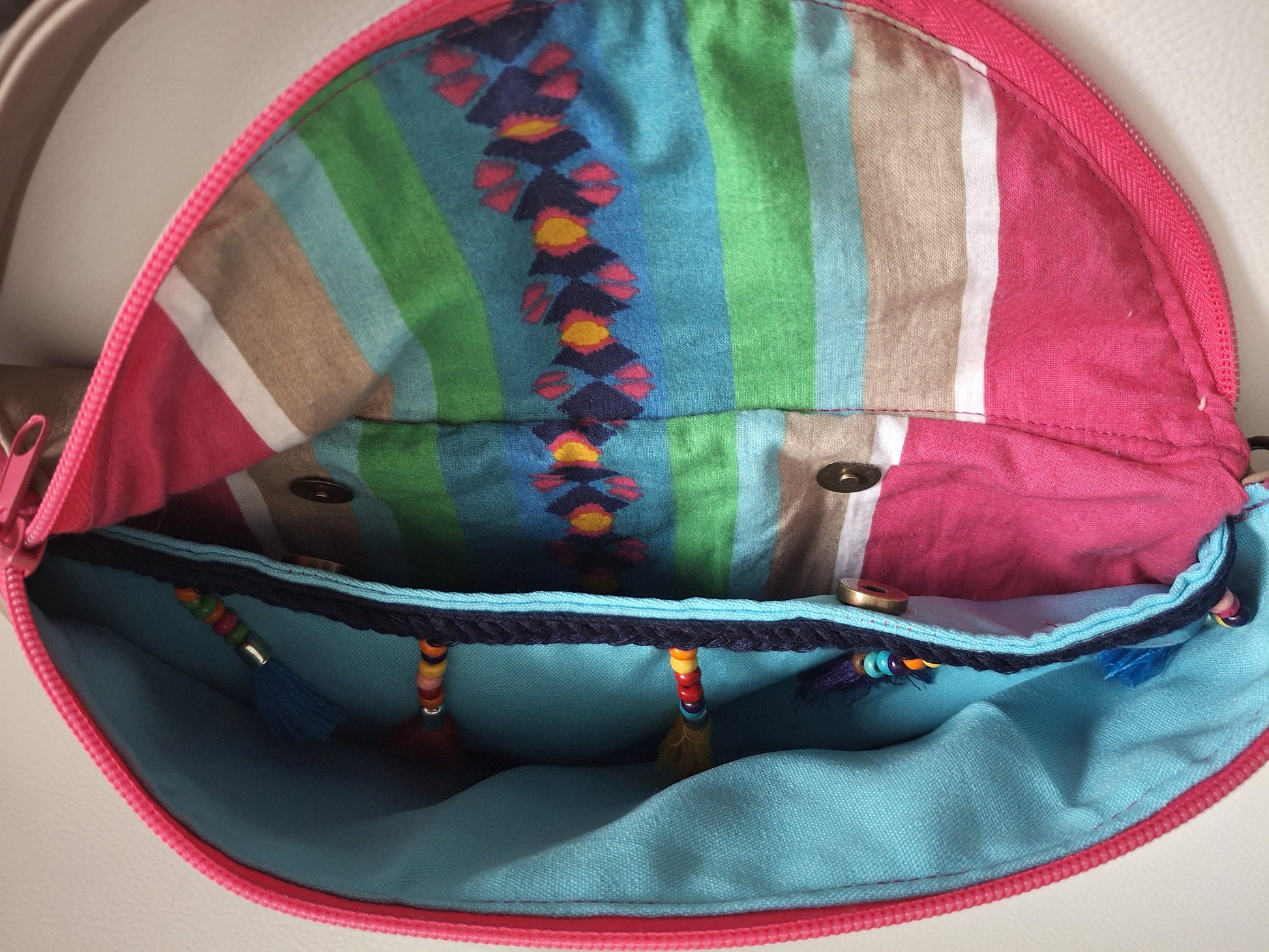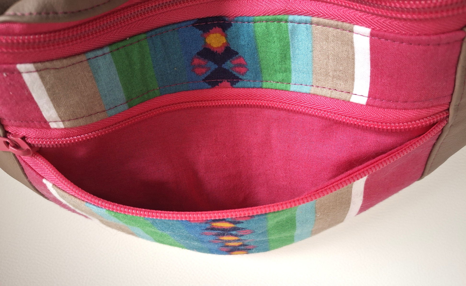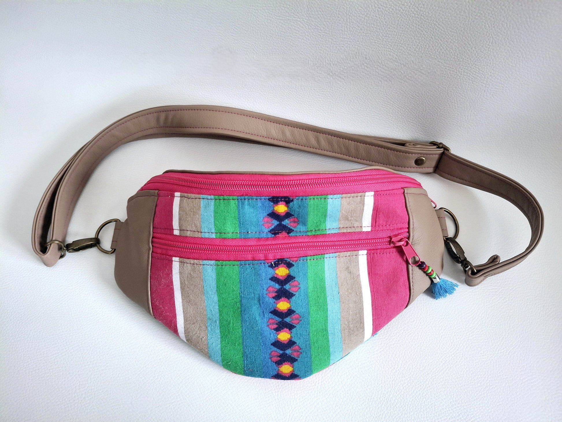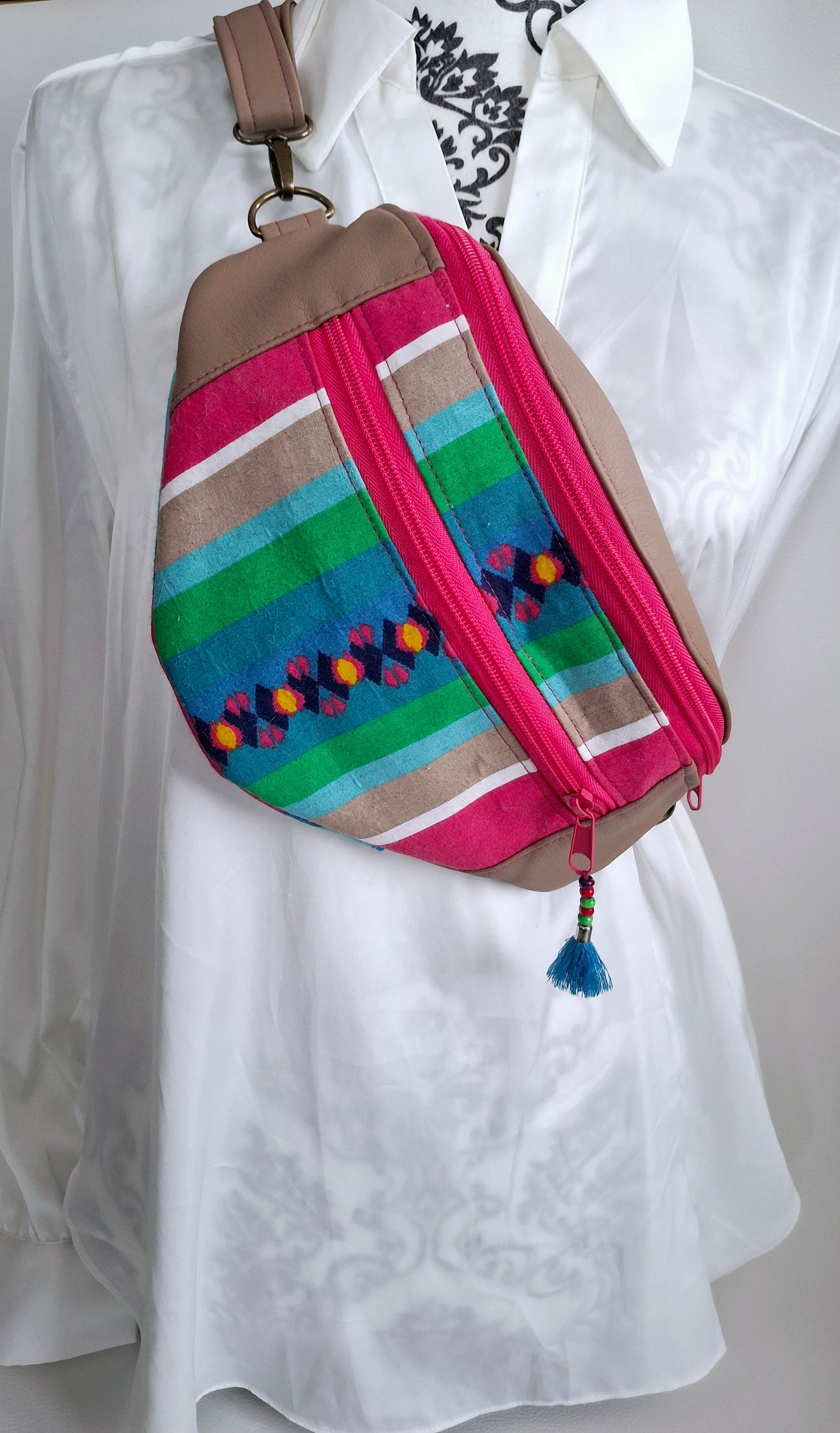 Le Sac Banane Lova, fabriqué en simili et tissu upcyclé aux couleurs vives, apporte une touche de fraîcheur à votre look. Il dispose d'une poche arrière discrète pour accéder facilement à votre téléphone, ainsi que d'une petite poche zippée à l'avant. La poche principale, également zippée, est divisée en deux par une poche plaquée aimantée et comprend un mousqueton, pour une organisation simple et efficace au quotidien.