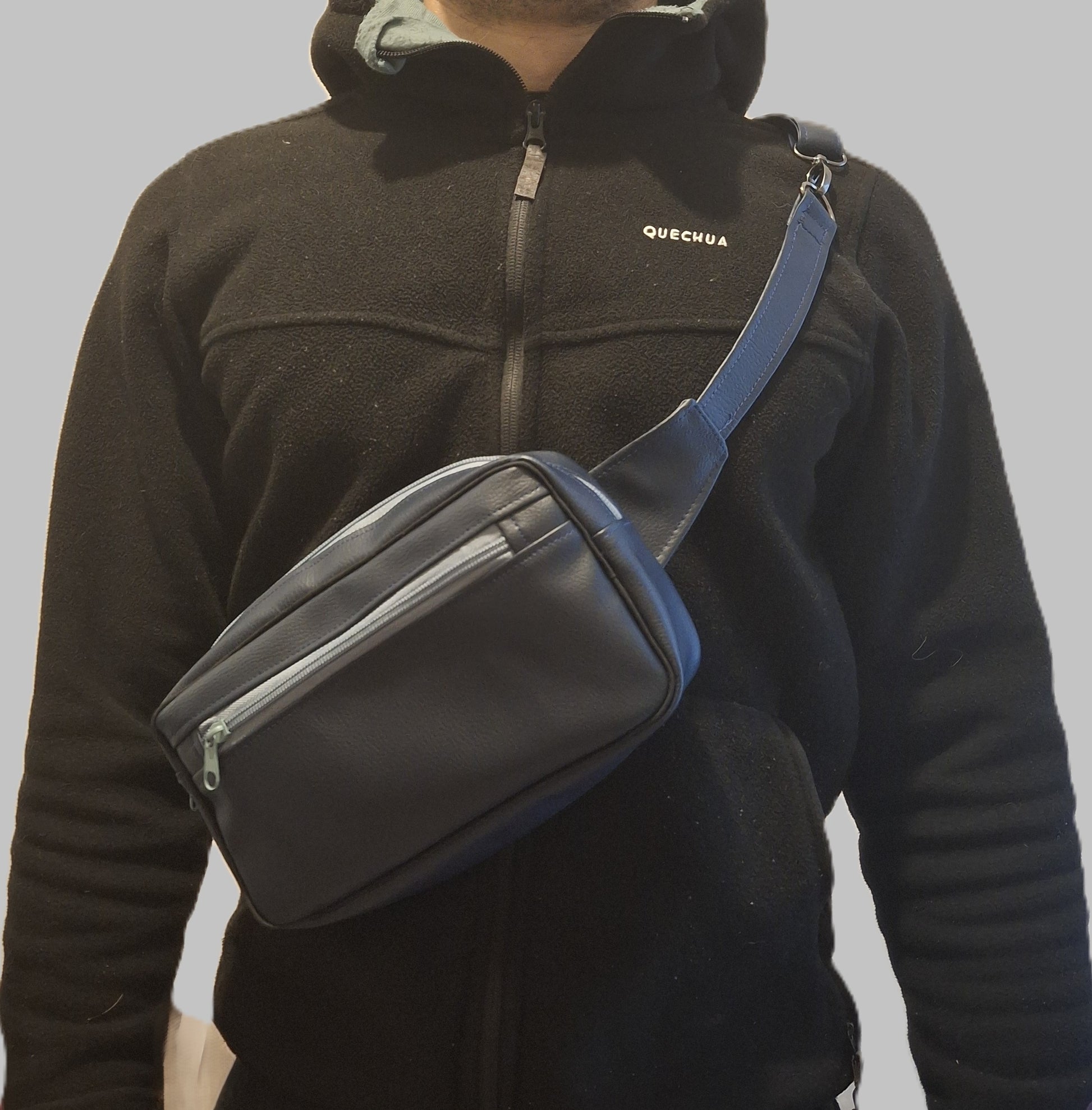 Le sac banane Milou, conçu en simili cuir bleu marine avec une doublure en coton gris, est idéal pour l’homme actif. Polyvalent, il se porte à la taille ou en amazone selon vos besoins. Sa poche avant zippée et sa fermeture à double curseur assurent un accès rapide et sécurisé à vos affaires. Une poche intérieure plaquée et une sangle réglable apportent confort et praticité au quotidien.