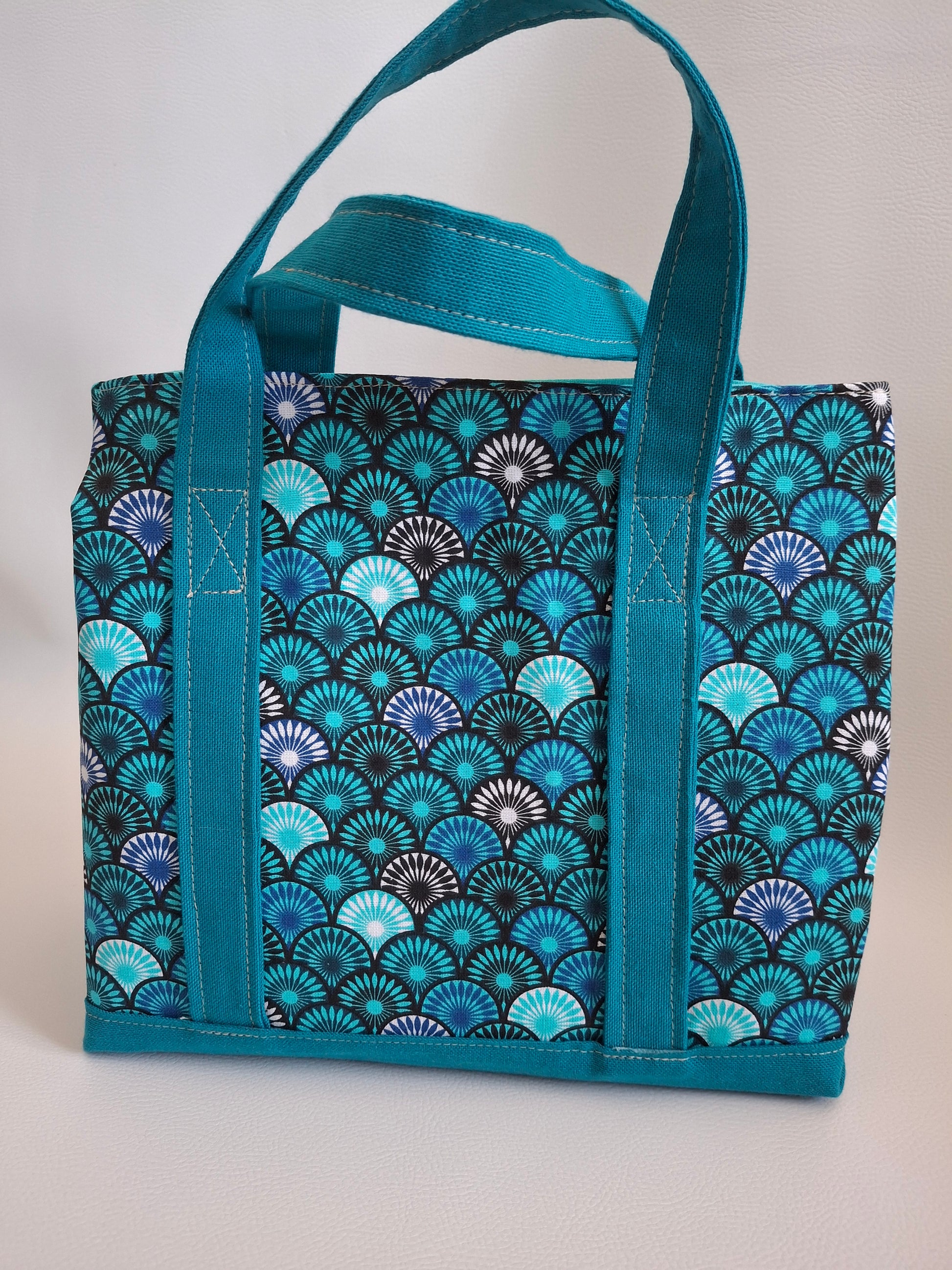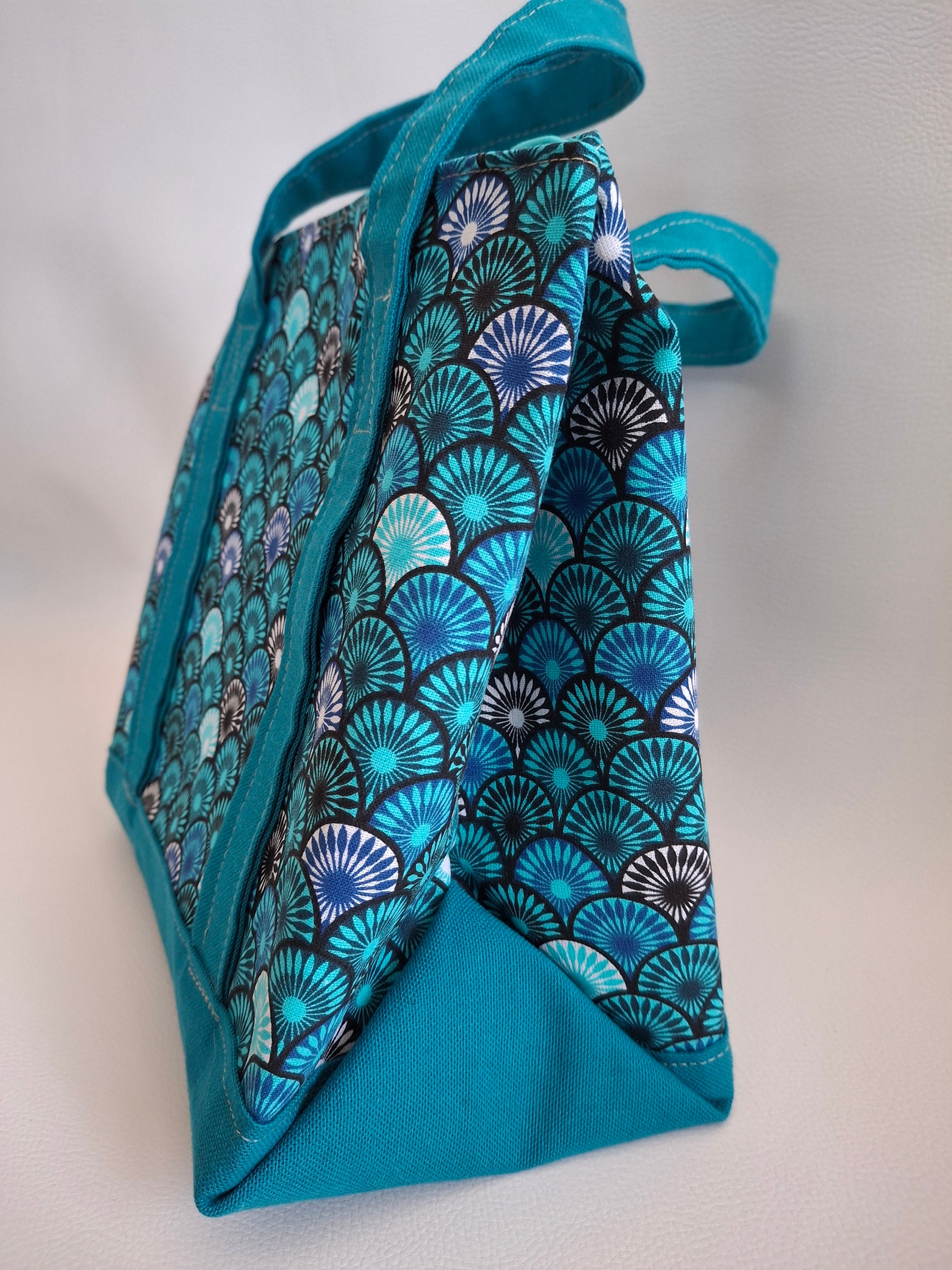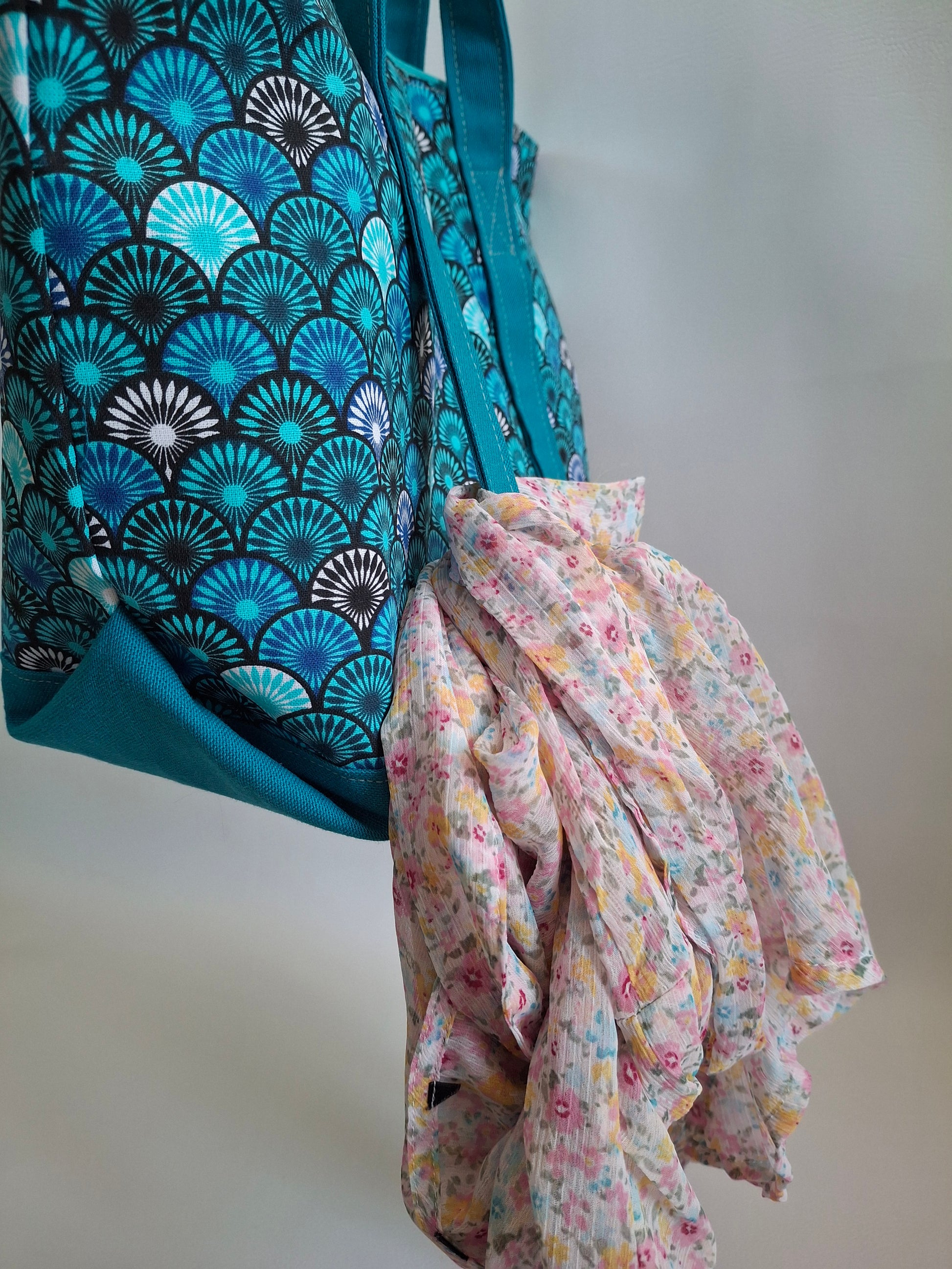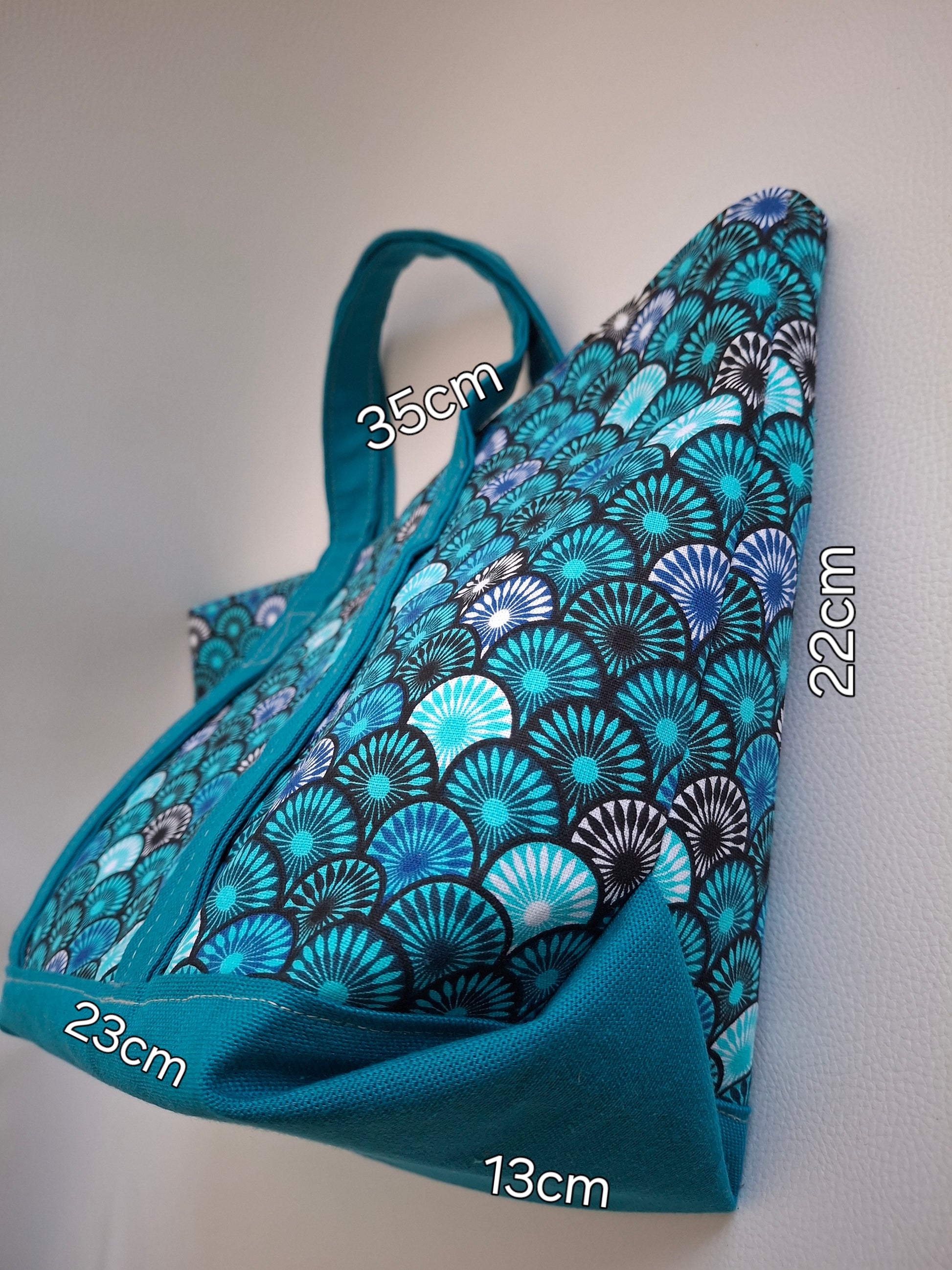 Le sac Blue Sky, en toile de coton turquoise à motifs, se porte élégamment à la main ou au bras. Léger et résistant, il allie praticité et style pour accompagner toutes vos sorties avec une touche de couleur raffinée.