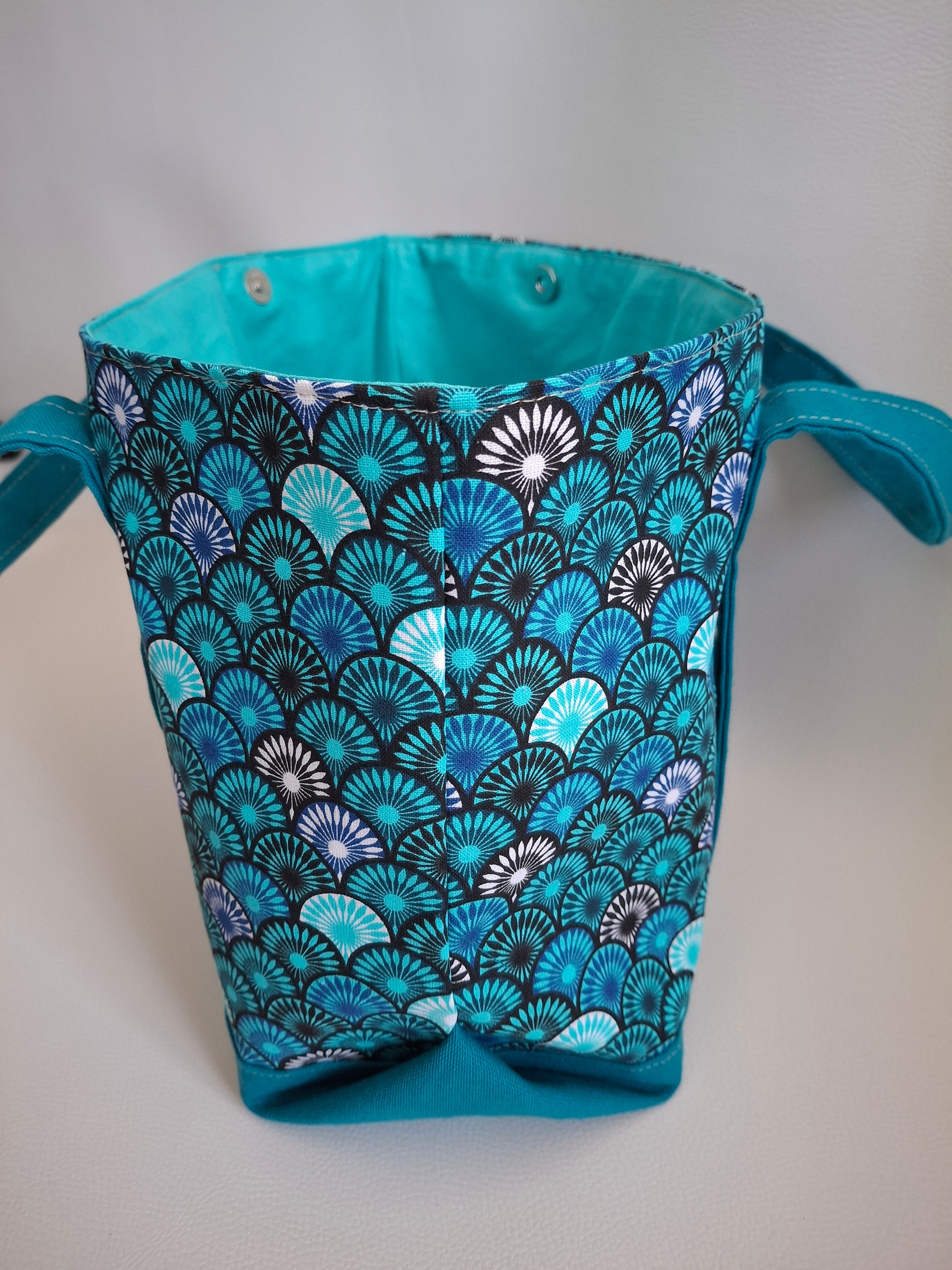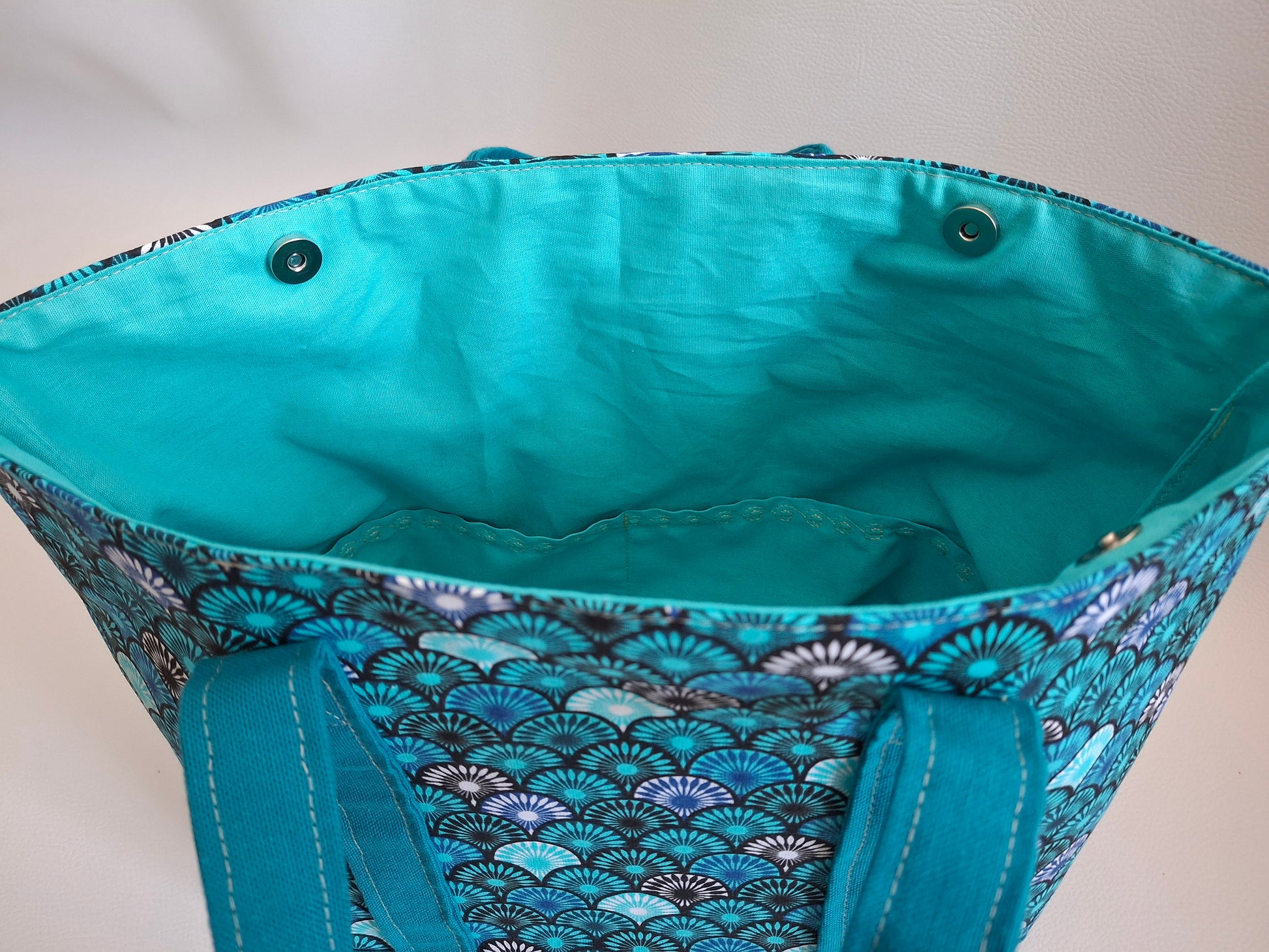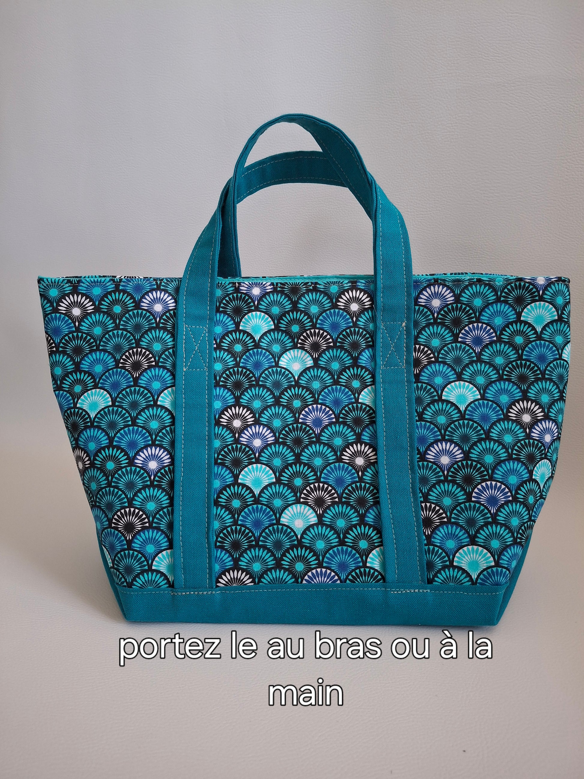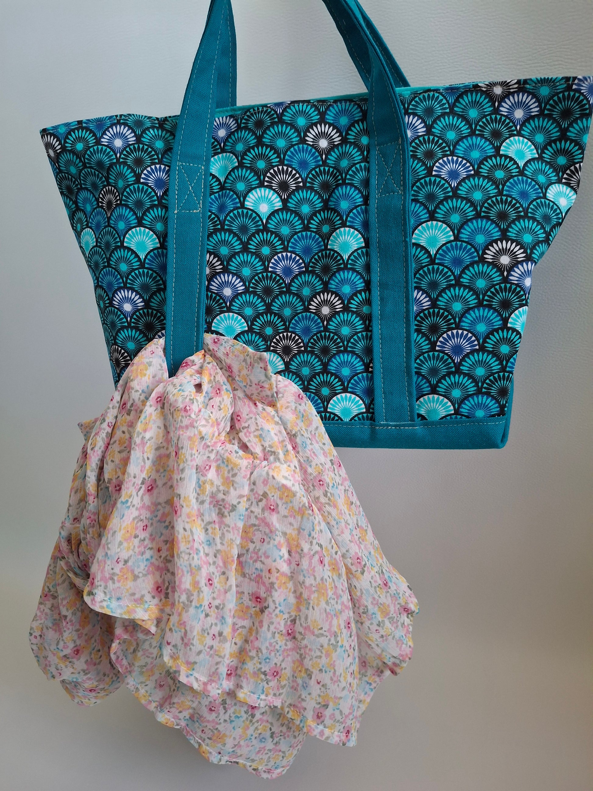 Le sac Blue Sky, en toile de coton turquoise à motifs, se porte élégamment à la main ou au bras. Léger et résistant, il allie praticité et style pour accompagner toutes vos sorties avec une touche de couleur raffinée.