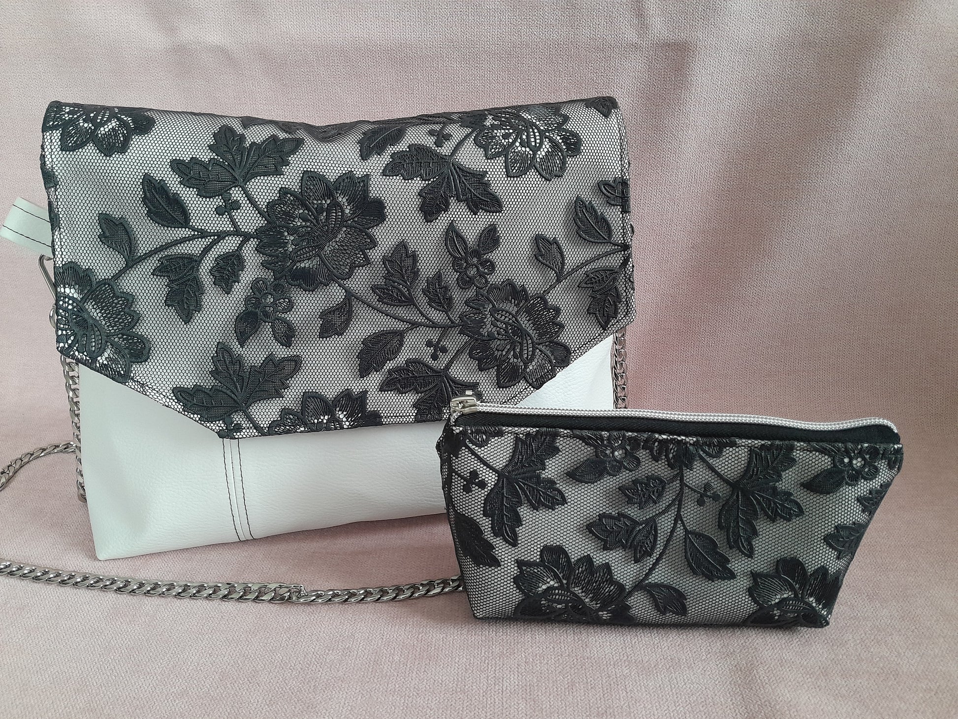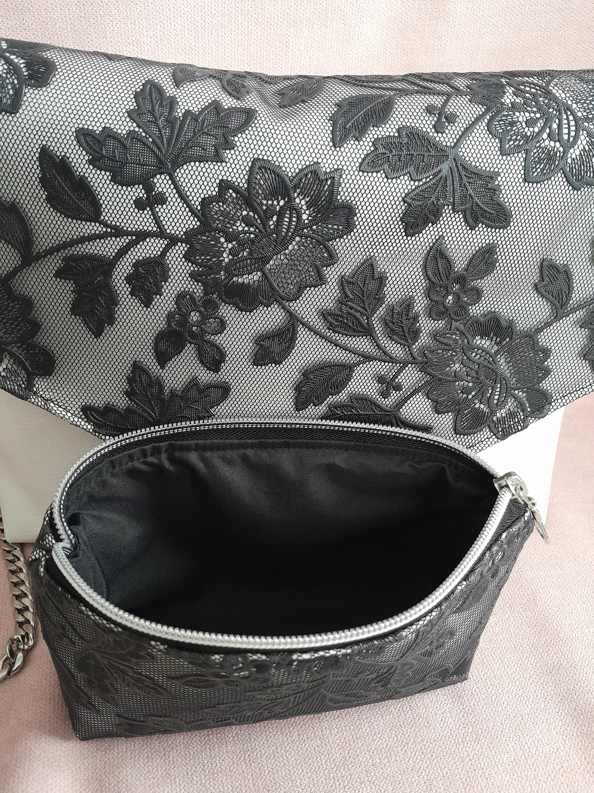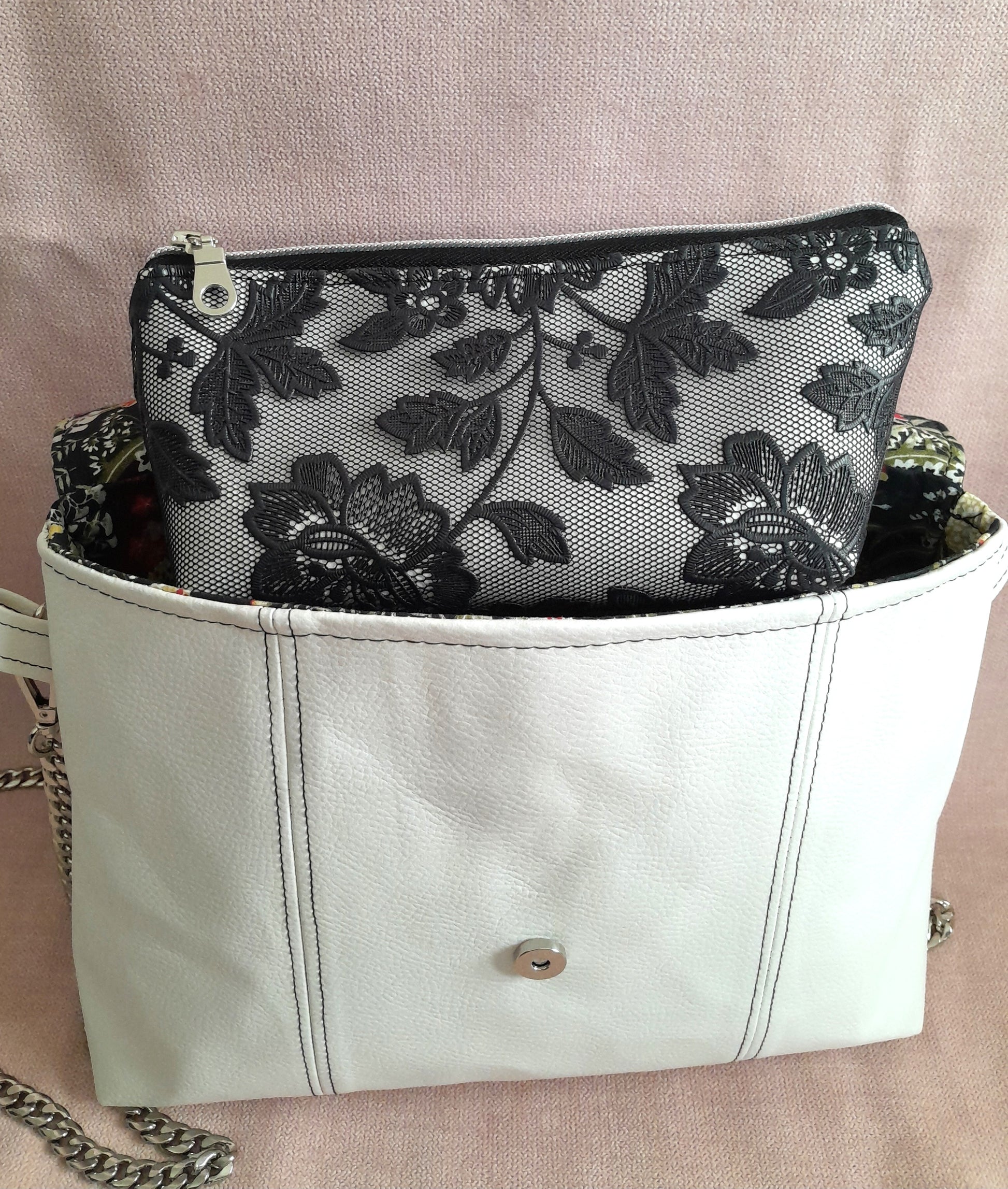Le sac Percy, accompagné de son portemonnaie en dentelle de simili noir et blanc, offre un style très chic et raffiné. Sa chaîne en acier inoxydable assure une solidité durable tout en apportant une touche moderne. Les surpiqûres délicates affinent la silhouette de l’ensemble, tandis que la doublure fleurie apporte une note élégante et féminine. Un choix parfait pour un look à la fois sophistiqué et pratique.