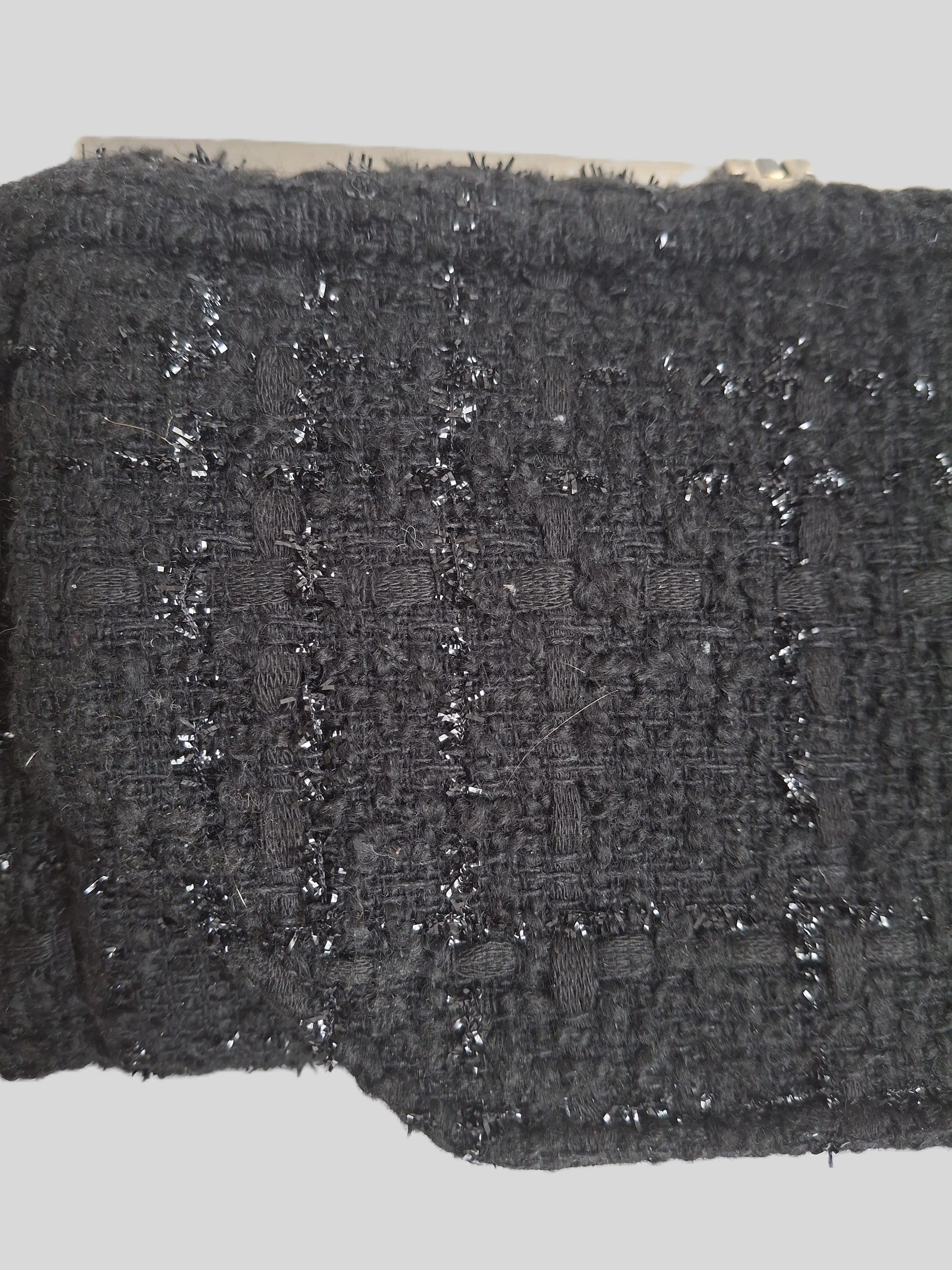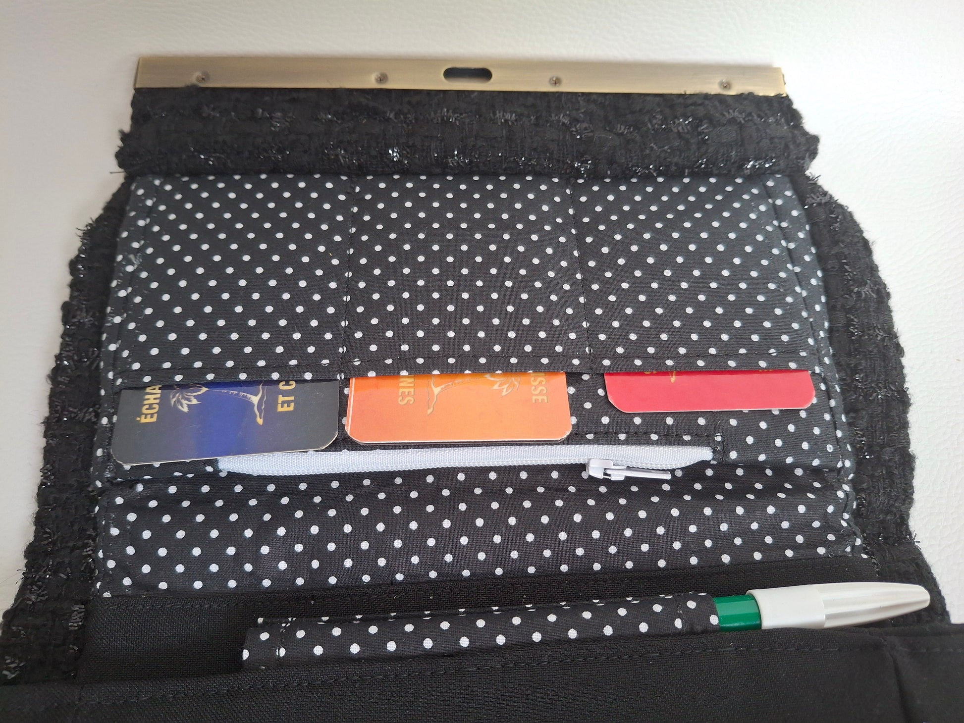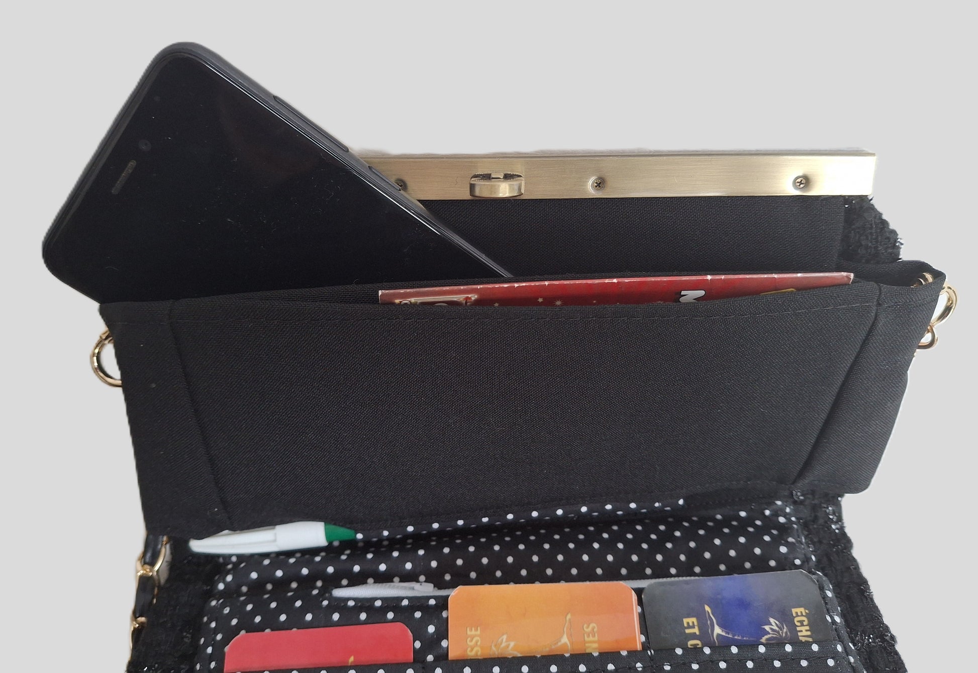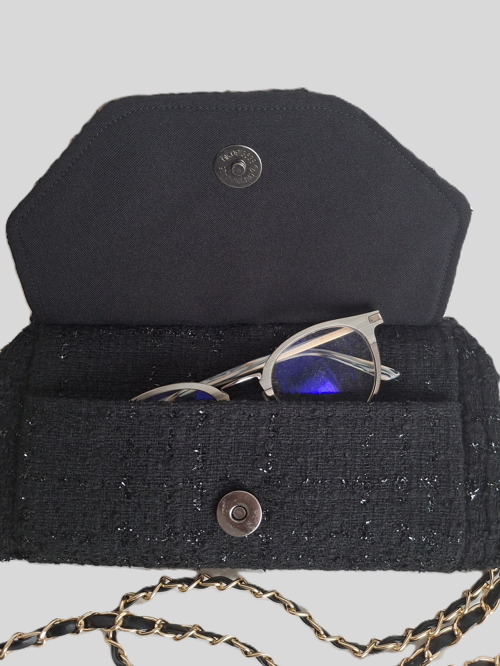 La Pochette Zephyr incarne l'essence du luxe discret. Son tissu noir profond, sublimé par un liseré brillant d'inspiration Chanel, affirme une élégance intemporelle. Organisée avec intelligence, elle propose des espaces dédiés pour vos lunettes, cartes, téléphone, porte-monnaie et stylo—chaque objet trouve sa place. Portez-la en bandoulière par sa chaîne raffinée, à la main ou intégrez-la à votre sac à main. Un accessoire de prestige qui transforme l'ordinaire en extraordinaire par la pureté de son design et la qualité de ses matières. Fermoir loquet