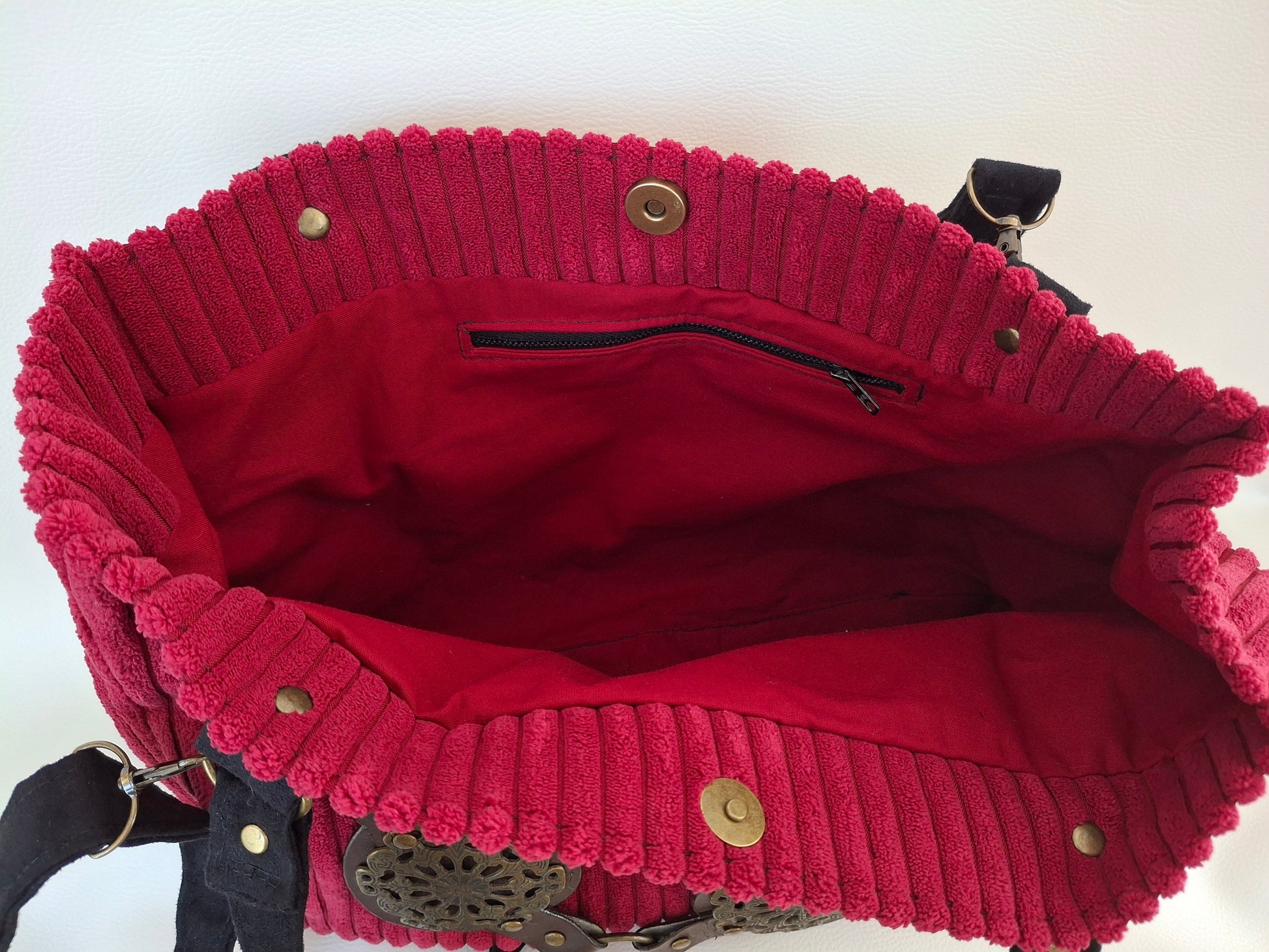 Le sac Savannah en velours côtelé bordeaux, anses en alcantara noir allie élégance et praticité pour votre quotidien. Orné de boucles en ceinture upcyclée, il offre une touche unique et responsable. Sa fermeture par fermoir aimanté garantit un accès facile, tandis que sa poche zippée permet de ranger vos petits essentiels en toute sécurité. Avec ses anses épaules et sa bandoulière réglable, il s’adapte à tous vos besoins, que ce soit au lycée ou au bureau pour transporter vos cours ou votre ordinateur. Un compagnon fiable et stylé au quotidien.