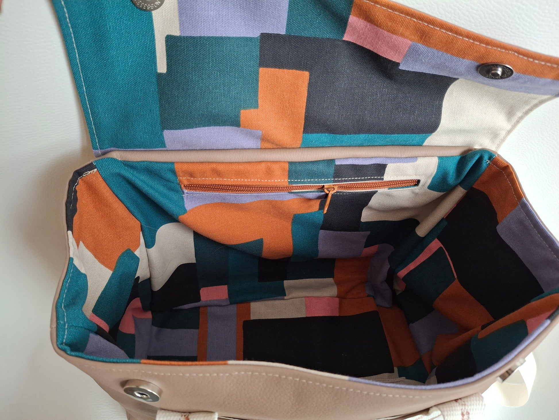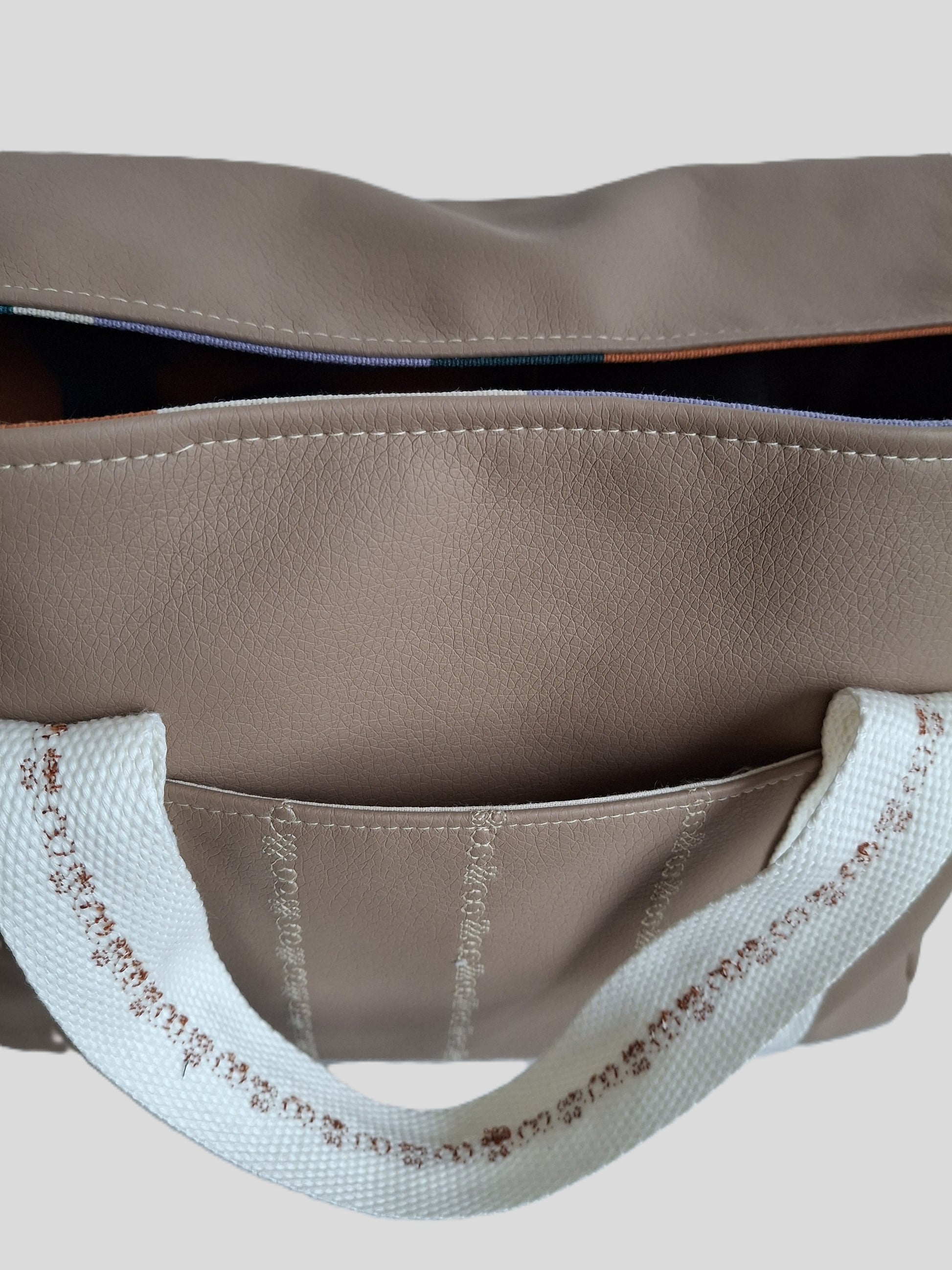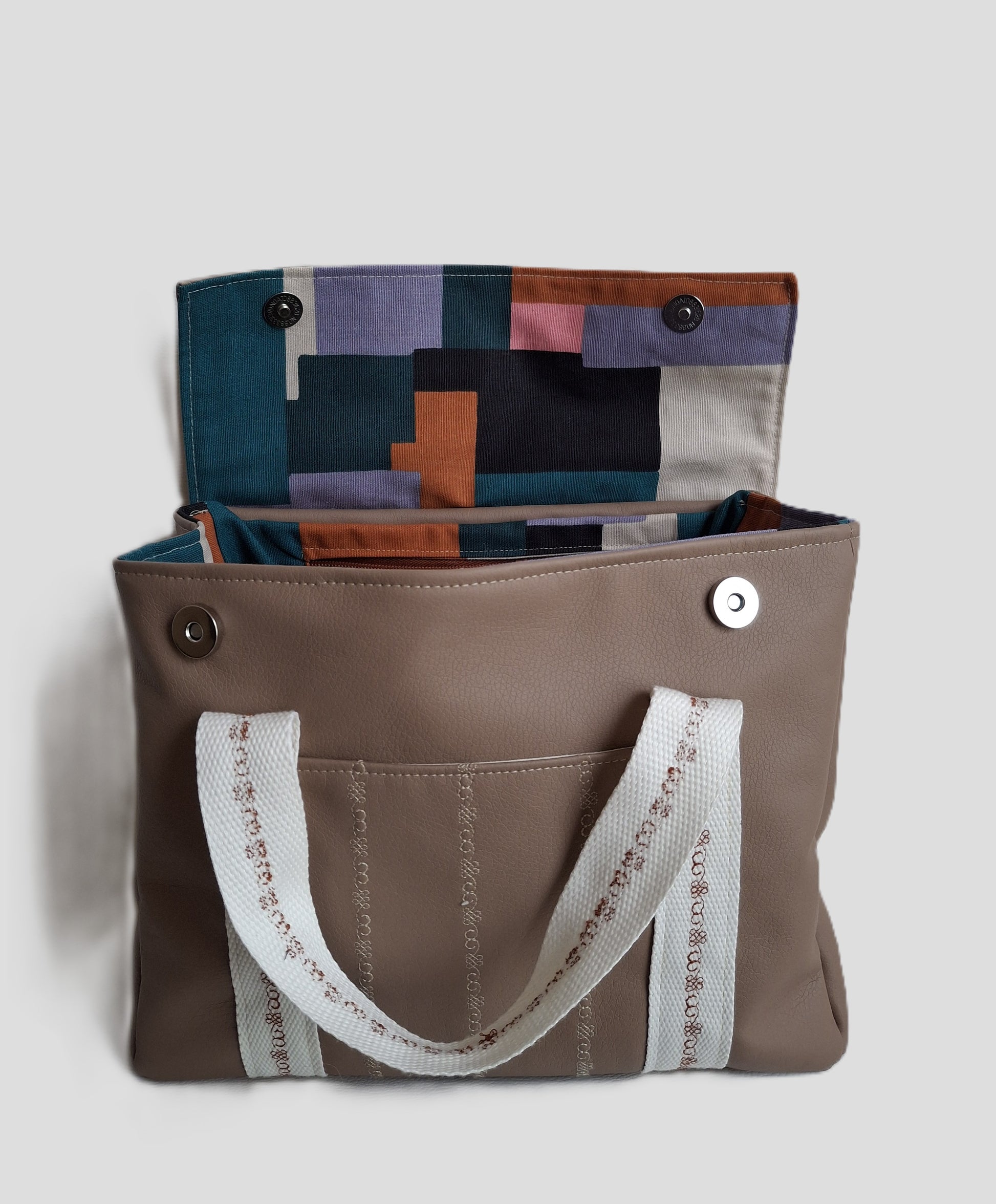 Alliez élégance et fonctionnalité avec le sac Tina, un concentré de charme et de modernité. Fabriqué à la main en simili taupe, il dévoile une doublure en toile de coton aux motifs géométriques colorés, pleine de pep’s. Ses anses brodées offrent un porté confortable et robuste, tandis que sa fermeture aimantée protège vos indispensables en un clin d’œil. Son intérieur joyeux, sa poche intérieure zippée, sa grande capacité et son style indémodable en font le compagnon idéal pour toutes vos aventures urbaines !