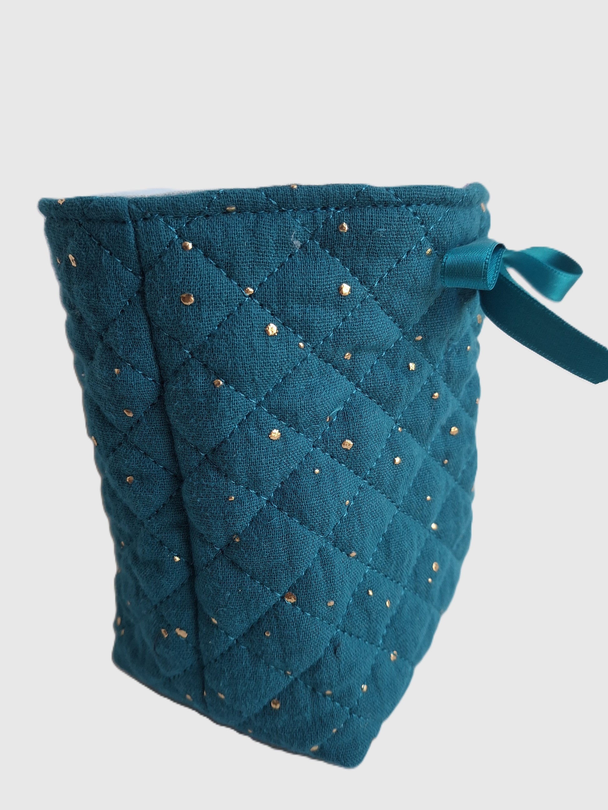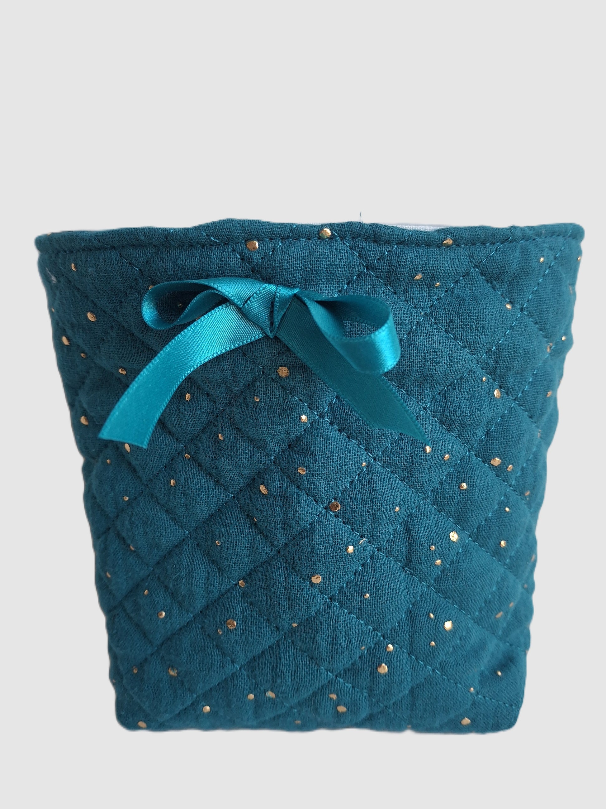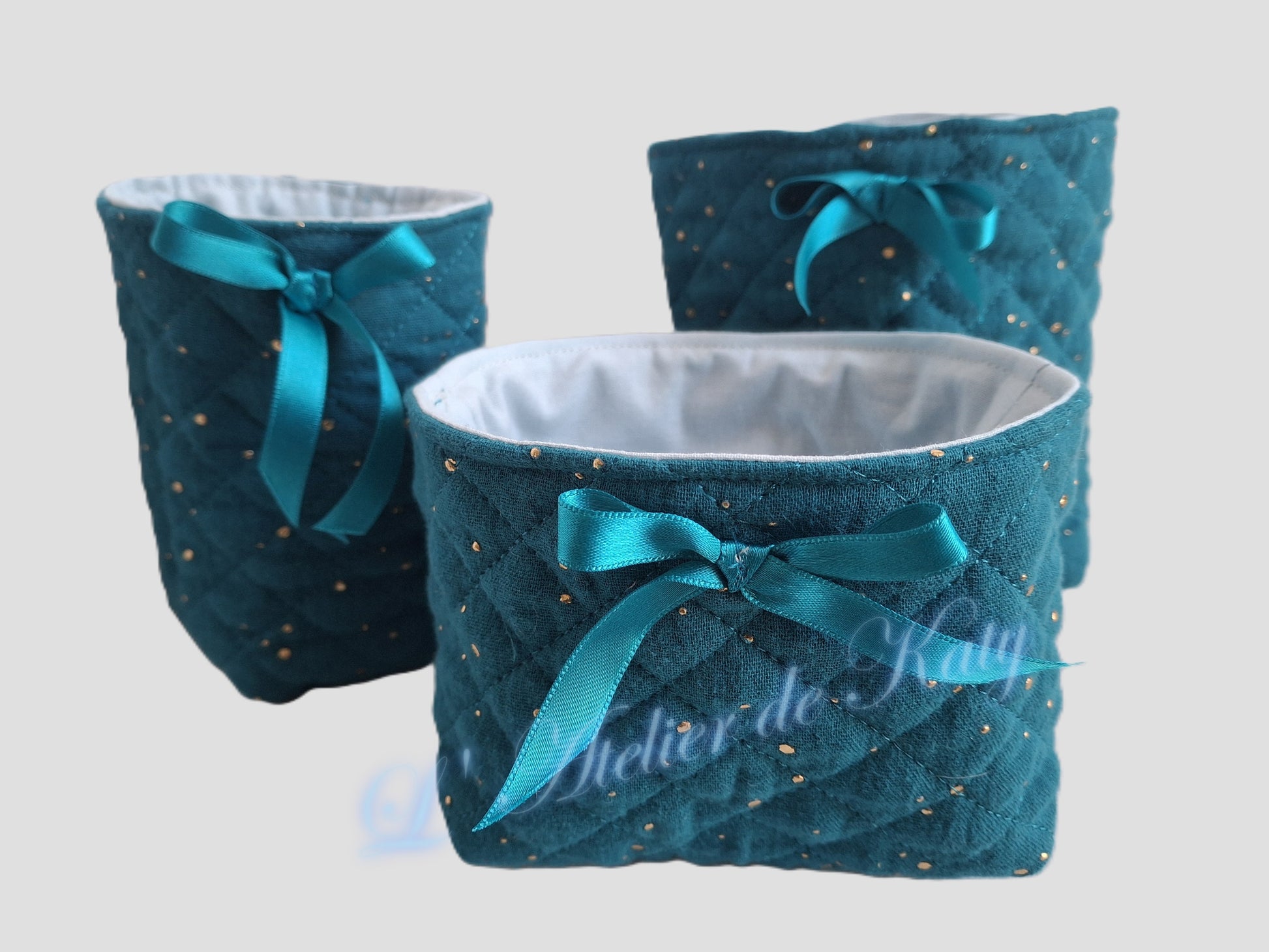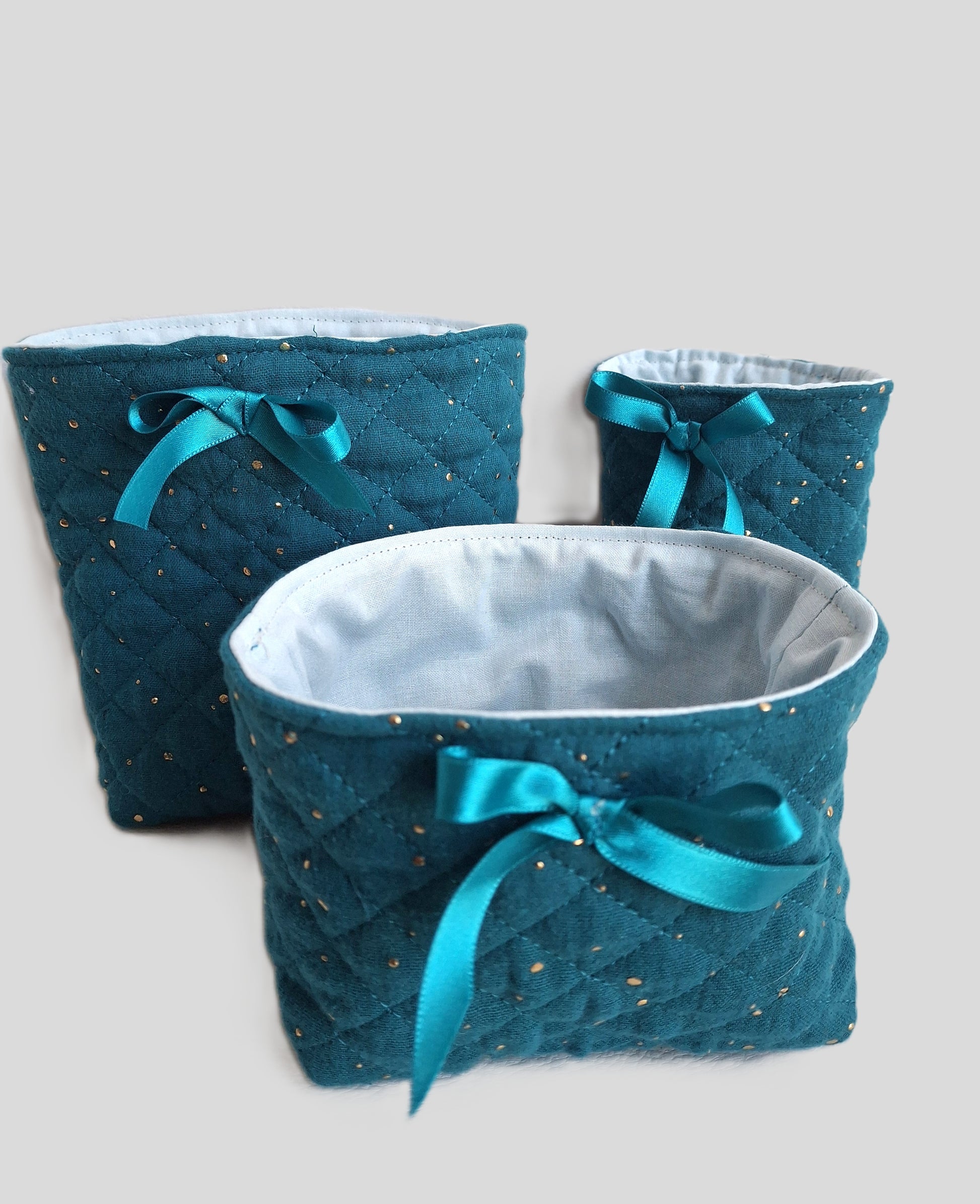 Apportez élégance et organisation à votre salle de bain avec ce trio de panières en tissu matelassé turquoise subtilement moucheté d’or. Conçues en trois dimensions distinctes, elles offrent un rangement raffiné pour vos lingettes démaquillantes, pinceaux et brosses, alliant fonctionnalité et charme coloré pour un espace à la fois pratique et sophistiqué.